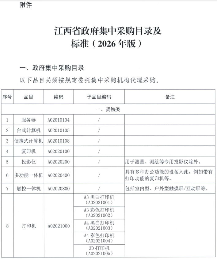 江西省政府集中采購目錄及標準(2026年版)
