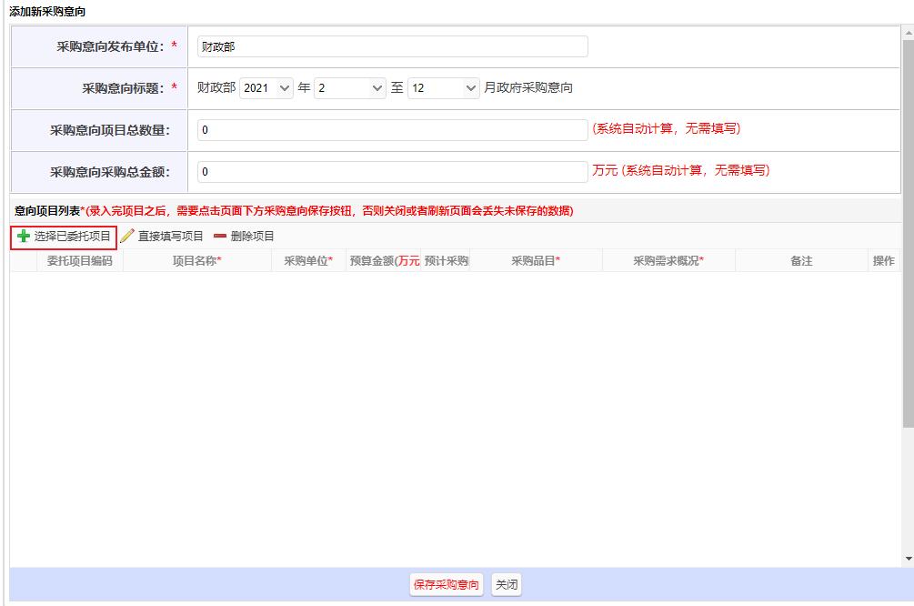 添加完項目信息后,需在【采購意向】頁面點擊下方“保存采購意向”按鈕,請勿關閉或刷新頁面,否則數據將會丟失,需重新錄入。