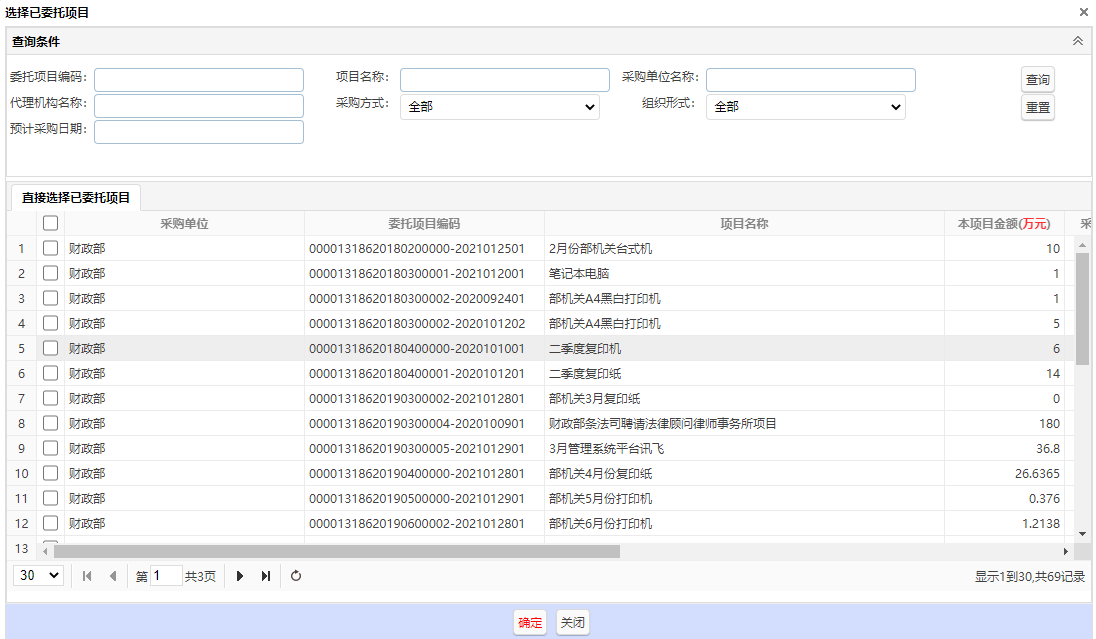 點擊選擇,然后勾選項目采購品目(最多選擇100個品目),選擇完成后點擊確定完成品目選擇。也可以按照品目編碼或者品目名稱篩選。