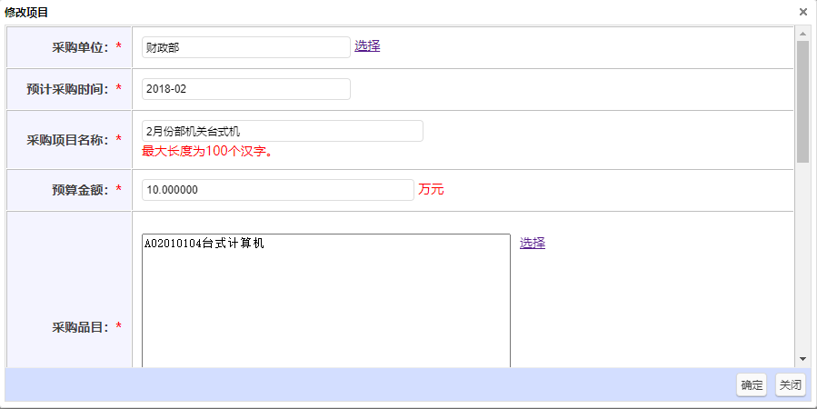 | 采購項目名稱 | 200(字符) | 是 | 100個漢字。 |