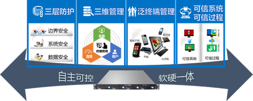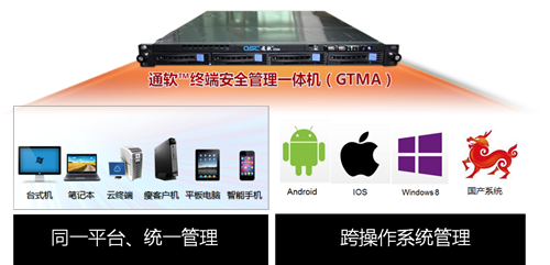 通軟新一代終端安全管理平臺GTMA,以自主可控、軟硬一體的終端管理一體機為基礎,為用戶提供了三層安全防護體系、三維管理機制、泛終端管理以及可信系統和可信過程兩種管理模式,從終端管理平臺到平臺運行的環境均實現自主可控,滿足國家信息安全建設要求,真正解決傳統終端安全管理的先天不足問題,為企業信息與網絡安全建設提供幫助。