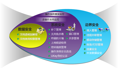 1.終端的邊界安全:對終端所有能夠與外界進行數據交互的途徑進行管理和監控,防止重要數據信息通過邊界外泄。