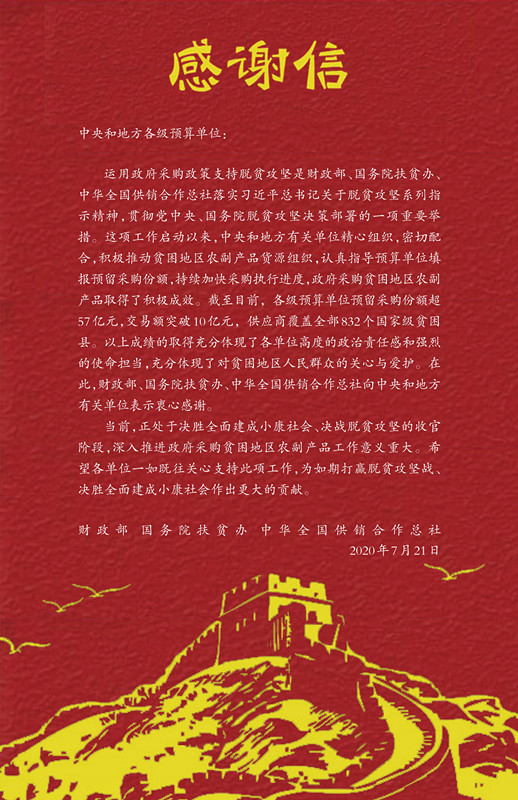 財政部致信感謝全國各預算單位運用政采政策支持扶貧